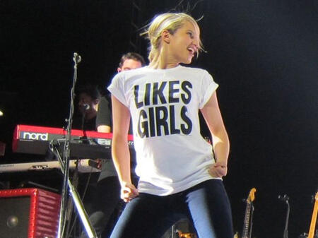 dianna durante el tour de glee (antes de conocer a taylor fue eso igual) un día decidió usar esta remera, por decisión propia, muchos pensaban que estaba saliendo del clóset hasta que el día siguiente publicó un testamento en su cuenta de tumblr diciendo que sólo lo hizo en apoyo